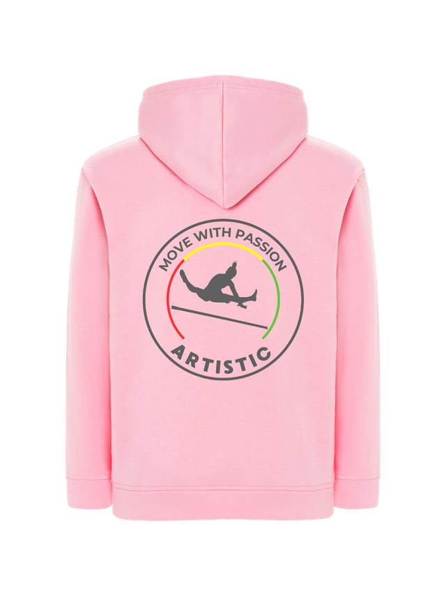 This hoodie is designed for those who live artistic gymnastics with intensity, dedication, and pride. Featuring a strong and meaningful design, the circular emblem highlights the word ARTISTICS and the message Move with Passion, symbolizing the essence of the discipline: strength, precision, control, and elegance in every movement.