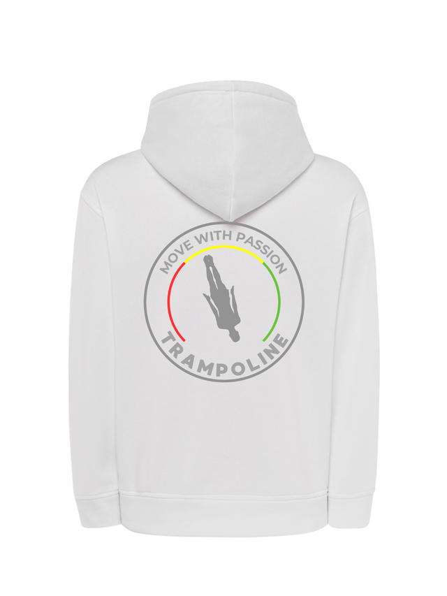 This hoodie is designed for those who live trampoline gymnastics with intensity, dedication, and pride. Featuring a strong and meaningful design, the circular emblem highlights the word TRAMPOLINE and the message Move with Passion, symbolizing the true essence of the discipline: height, control, rhythm, precision, and confidence in every jump.